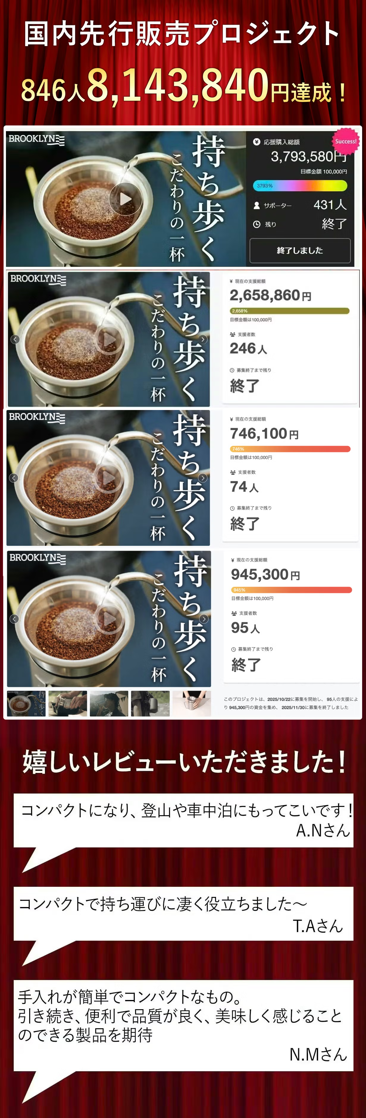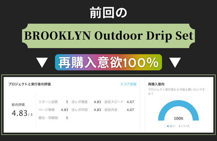- こんにちは。Brooklynは、海外で成功し、検証されたクラウドファンディング製品を国内に紹介します。モバイル、生活用品、コーヒーツール、ヘルス分野の製品の中で、最も有用で高品質な製品を支援者の皆様にいち早くご紹介していきます!