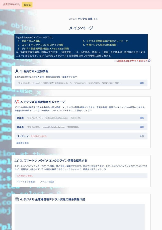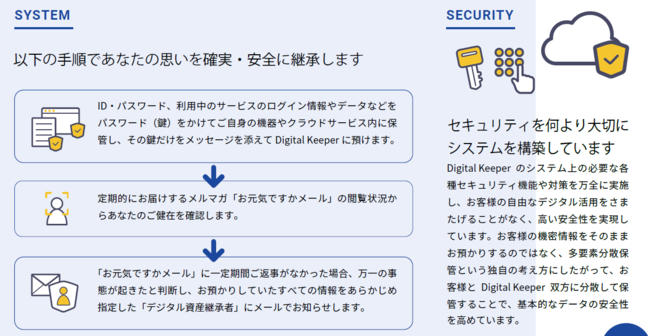当社が運営しているDigital Keeperは、「開かないスマホ問題」による遺族が困るデジタル遺産の発生防ぐための、デジタル資産の管理・保管・継承を安全に素早く行うWEBサービスです。
