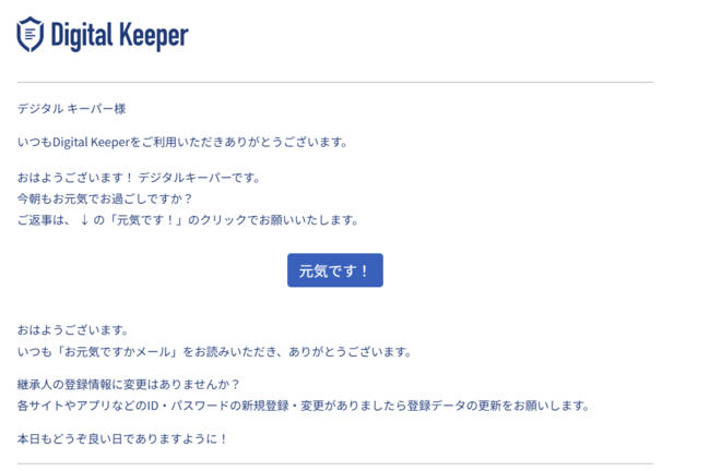 本人の万が一の際の判断については、毎週月曜日にお送りする「お元気ですかメール」に反応がなく、また一定期間の確認プロセスを経ても反応がない場合に、「万が一」の事態が発生したと判断して、家族・友人・同僚など事前に登録していた継承者に情報が通知される仕組みです。