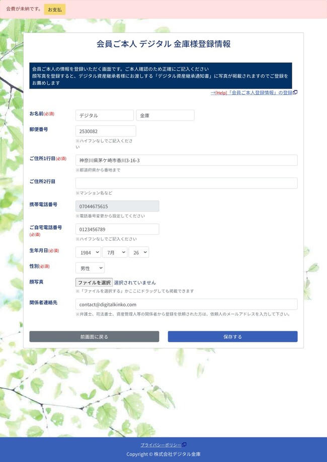 本人の万が一の際、あらかじめ指定した人にスマホなどのログイン情報を記した「デジタル資産継承通知書」をメール送信するサービスです。