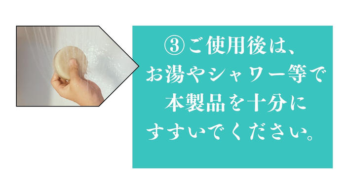 ・ご使用後は肌を良く洗い流しローション、もしくはクリームを塗るなどし、お肌を保湿してください。(冬場または乾燥肌の方は、たっぷりと保湿してください。)