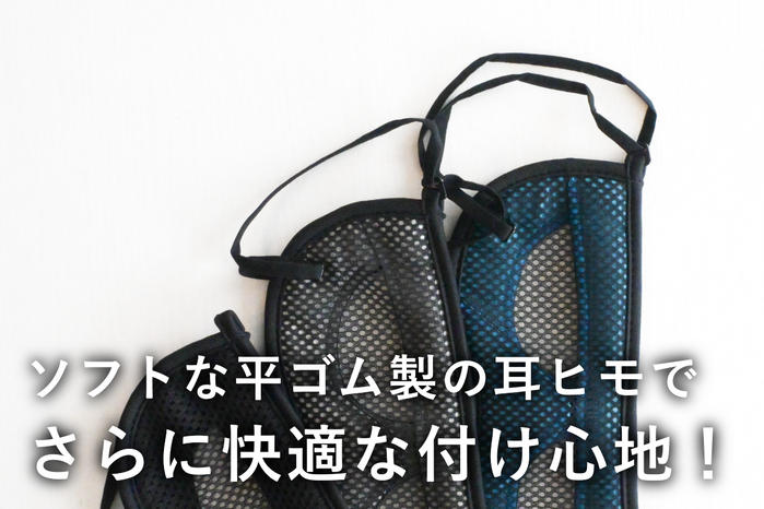 - 耳ヒモは細くしなやかな平ゴムタイプだから、顔にピタッとフィットするのに締め付け感や耳に痛みを感じにくいのも大きなポイント!