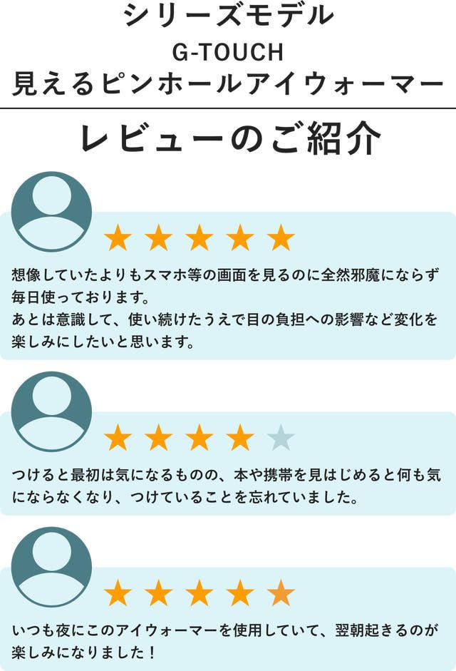 - これまで多くの方にご愛用いただいた「見えるアイウォーマー G-TOUCH / ピンホールアイウォーマー」がつけ心地と素材を一新!最新の特許技術(申請中)により改良され進化した見えるアイウォーマーシリーズ第3弾「メディカルサーモアイウォーマー」がついに新登場!