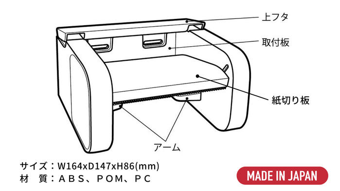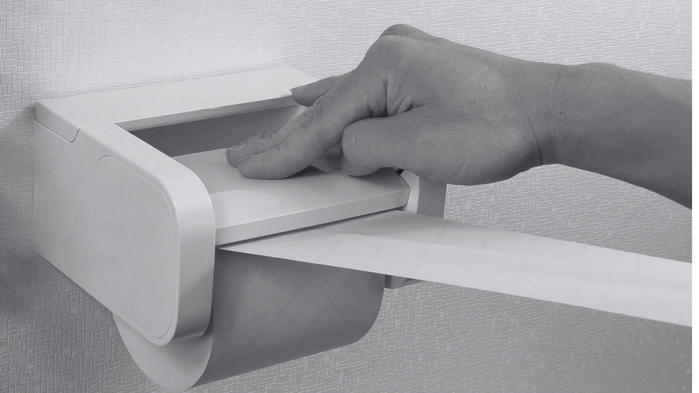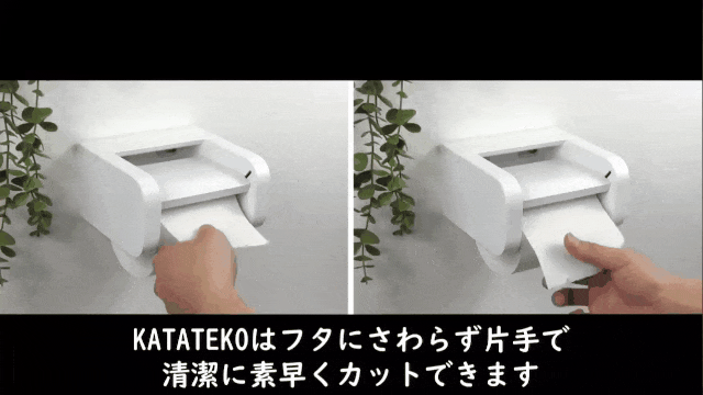 - カタテコはフタを2枚に分けたことでトイレットペーパーホルダー自体に片手の役割を持たせています。ペーパーを引き上げると紙切り板の手前側が上がり、後ろ側がペーパー本体を押さえることで制御(ペーパーが動かない)され、手前側にあるカッターでペーパーを簡単にカットできます。