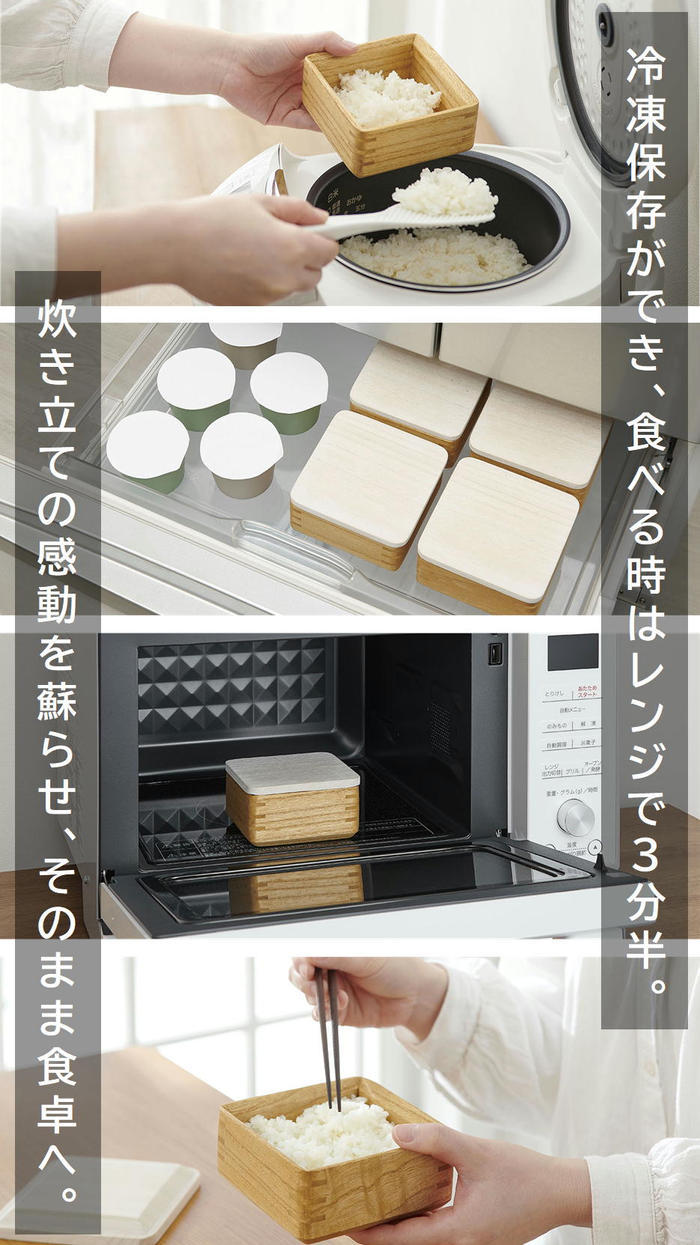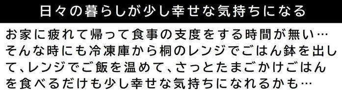 「冷凍ご飯を炊きたてのようにふっくらと美味しく召し上がっていただきたい!」そんな想いからkirisai 桐のレンジでごはん鉢を開発しました!"蒸気の力"と"桐の調湿力"で冷凍ご飯がよみがえる。 -