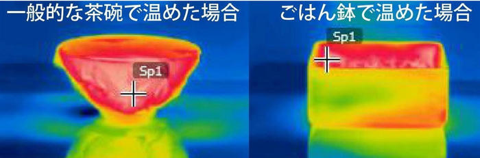 - 桐のレンジでごはん鉢で温めた直後のサーモグラフィカメラの画像です。