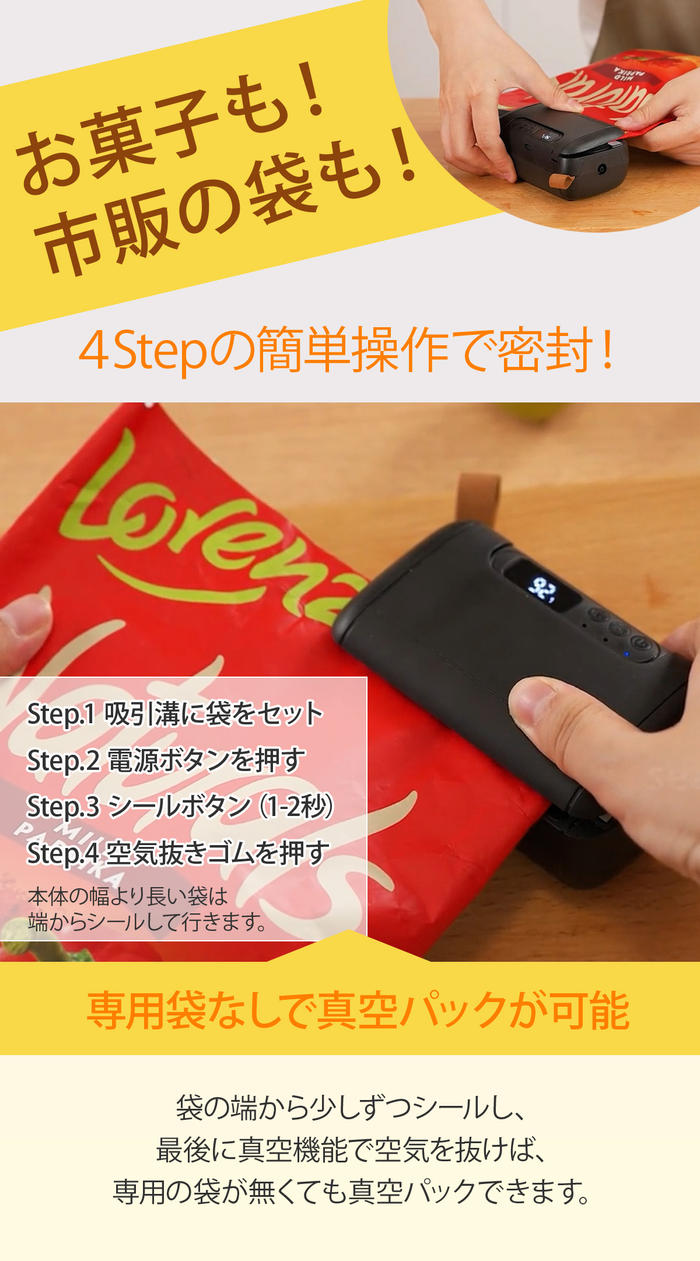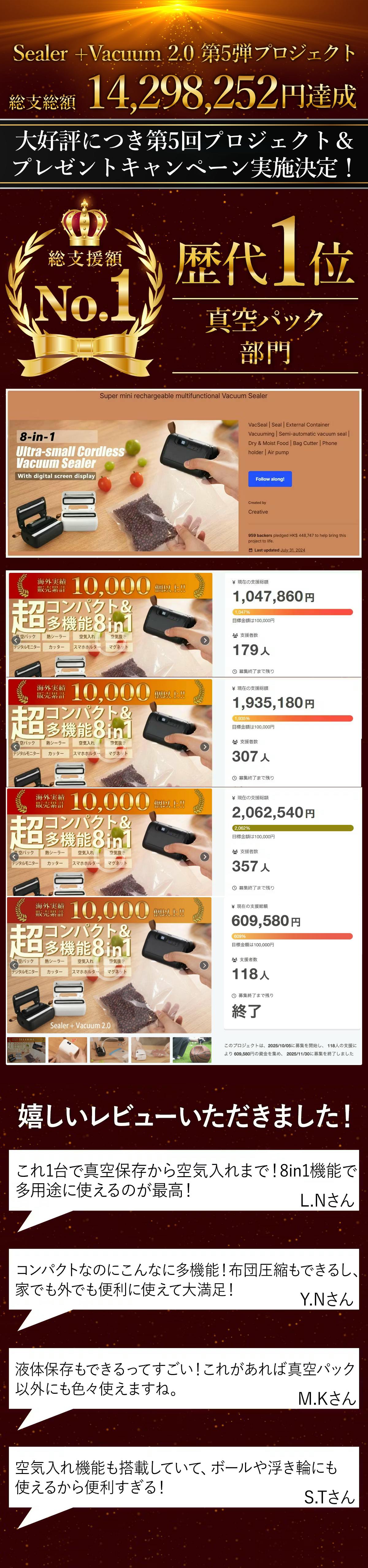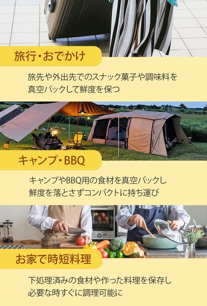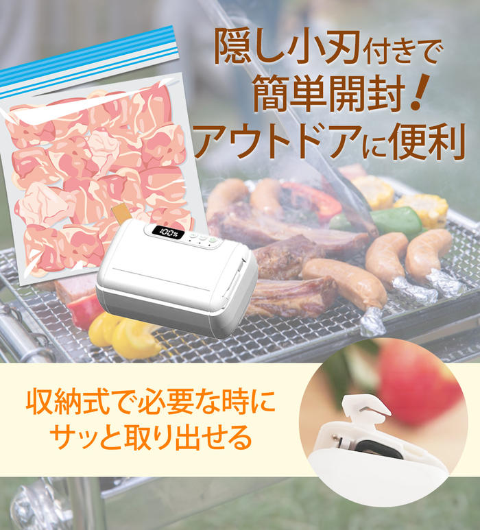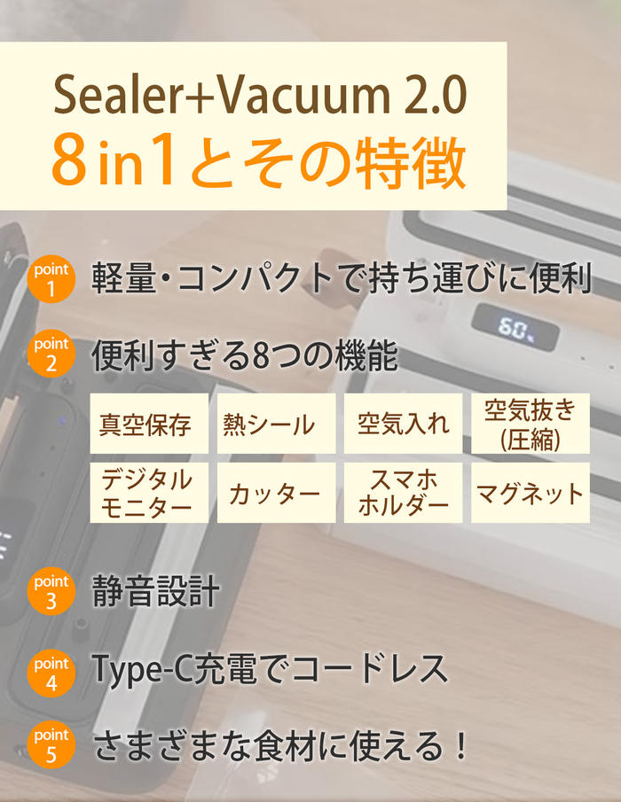 - 「Sealer+Vacuum 2.0」は、家庭やアウトドアで多用途に使えるコンパクトさと強力な吸引力を両立し、誰でも簡単・手軽に真空保存や圧縮が可能になるようニーズに応えるために開発されました。