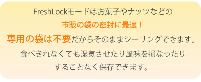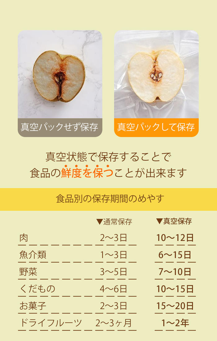 迅速に袋の中を真空にし、しっかりとシールします。真空パック用の特別な袋も必要ありません。ボタンを押すだけでさまざまな食品を保存できます。 -