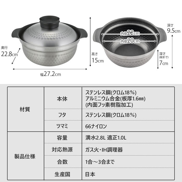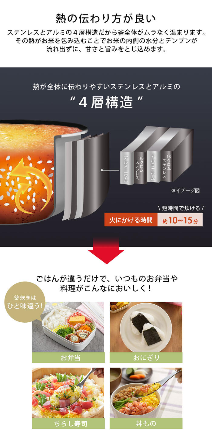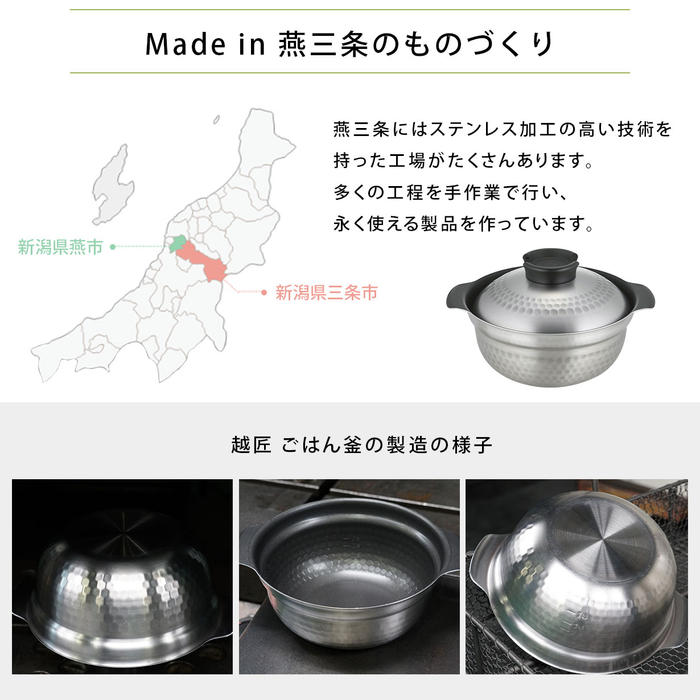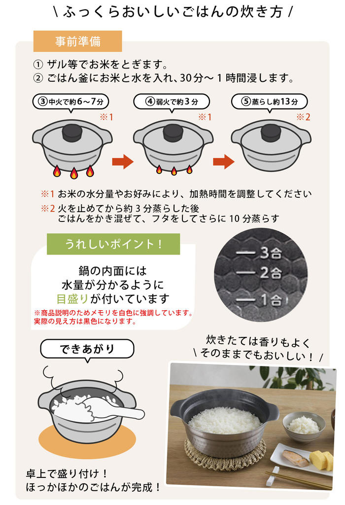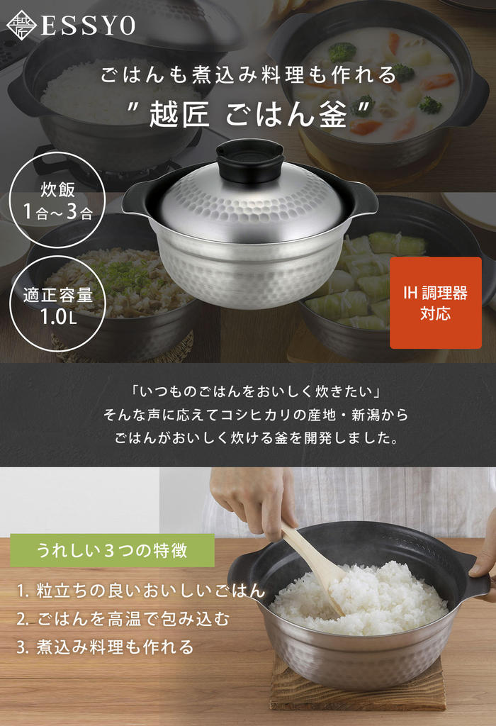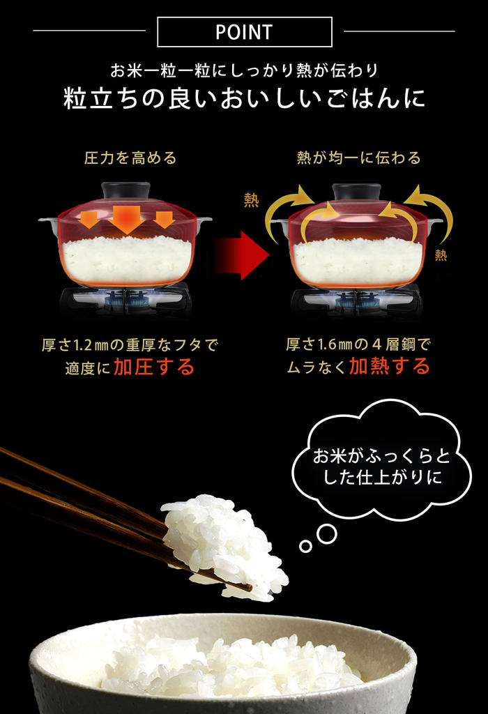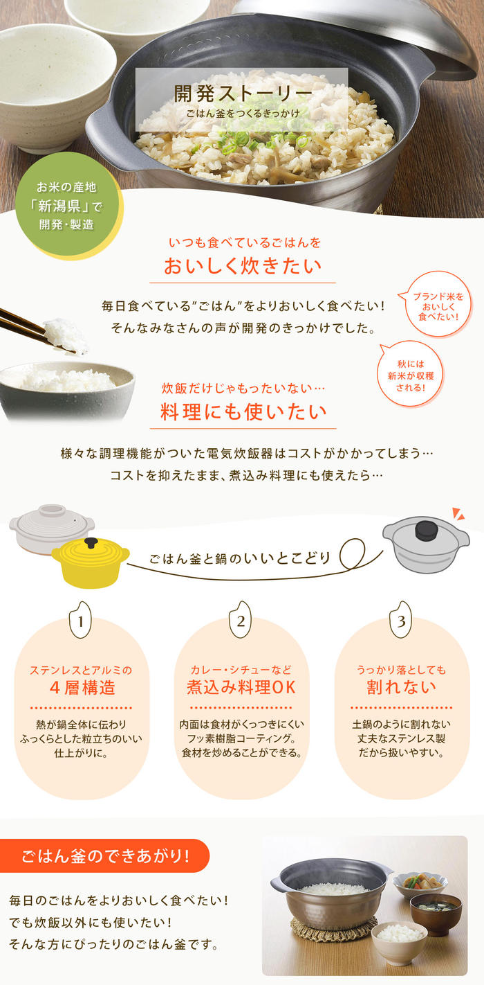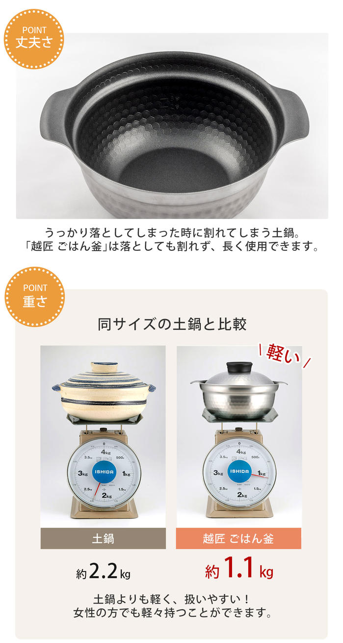 - 産地にこだわったブランド米などの特別なお米には、より一層ごはんの美味しさが引き出せるこの越匠ごはん釜を使ってみてはいかがでしょうか。