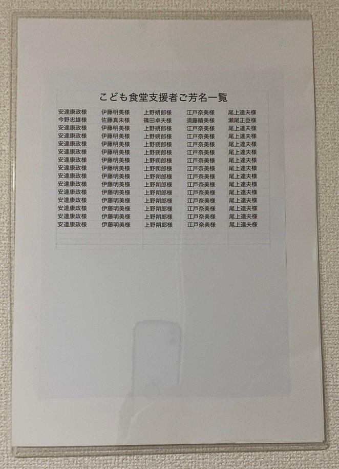 - こども食堂を開催する場にて、ご支援いただいた方のお名前をご芳名一覧として掲載させていただきます。