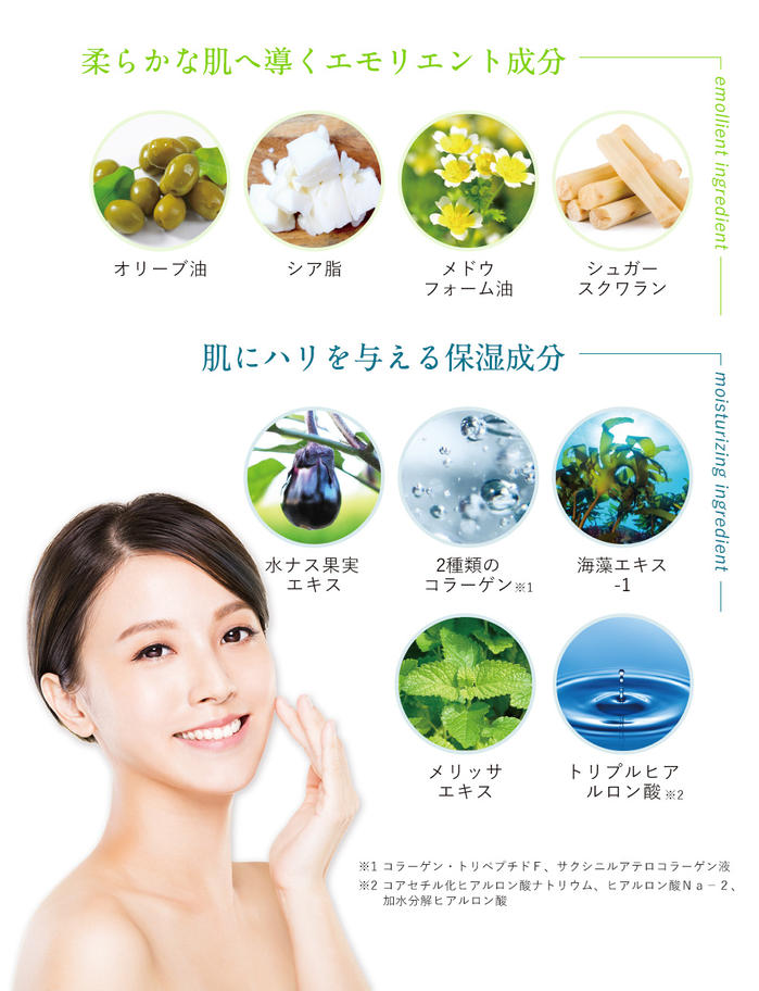 マルトース・ショ糖縮合物、シア脂、オリブ油、ノニ果汁、ステアロイルフィトスフィンゴシン、アセチル化ヒアルロン酸ナトリウム、ヒアルロン酸Na-2、加水分解ヒアルロン酸、海藻エキス-1、アセロラエキス、水ナス果実エキス、黒砂糖エキス、コラーゲン・トリペプチド F、ヒメフウロエキス、メリッサエキス、オウゴンエキス、サクシニルアテロコラーゲン液、セイヨウハッカエキス、BG、シュガースクワラン、植物性スクワラン、濃グリセリン、グリセリン、ステアリン酸ポリグリセリル、メドウフォーム油、親油型ステアリン酸グリセリル、トリエチルヘキサン酸グリセリル、ステアリルアルコール、ジメチコン、ラウロイルグルタミン酸ジ(フィトステリル・オクチルドデシル)、カルボキシビニルポリマー、キサンタンガム、水酸化K、天然ビタミンE、ジエチレントリアミン5酢酸5Na液、1,2-ペンタンジオール、フェノキシエタノール、精製水