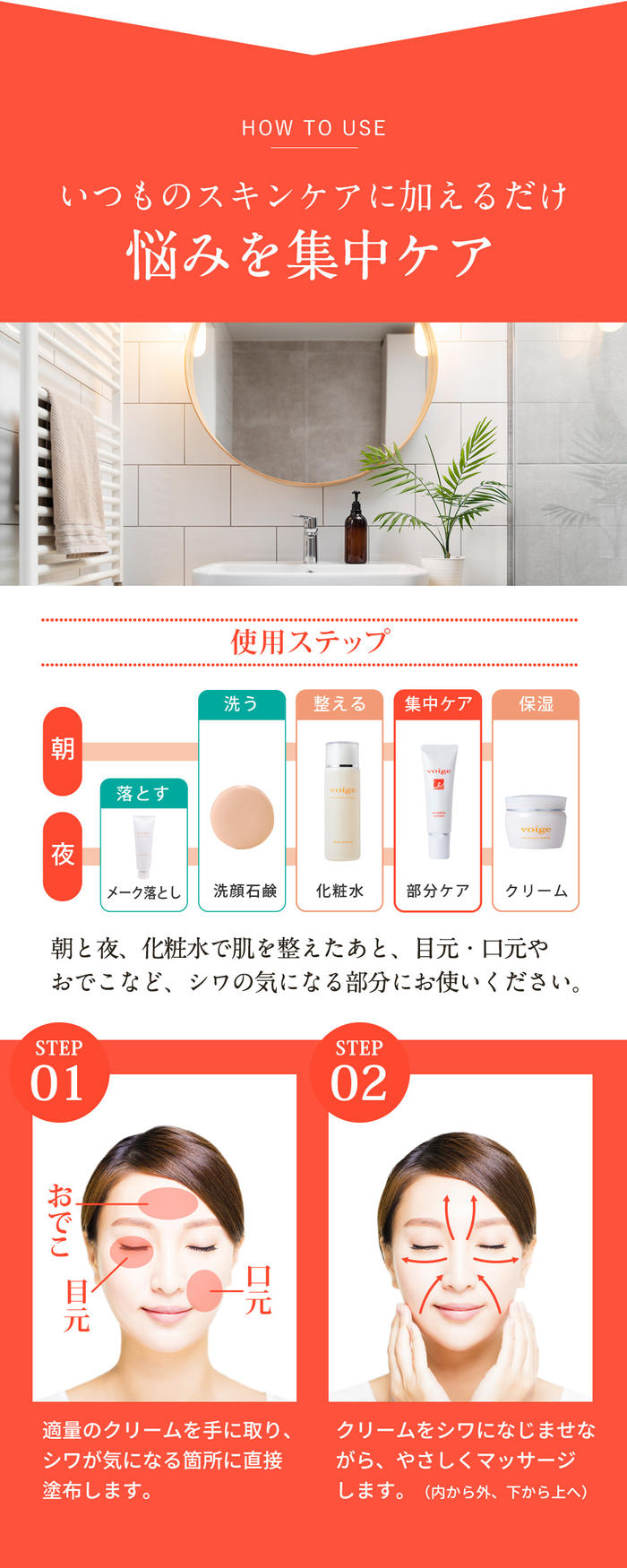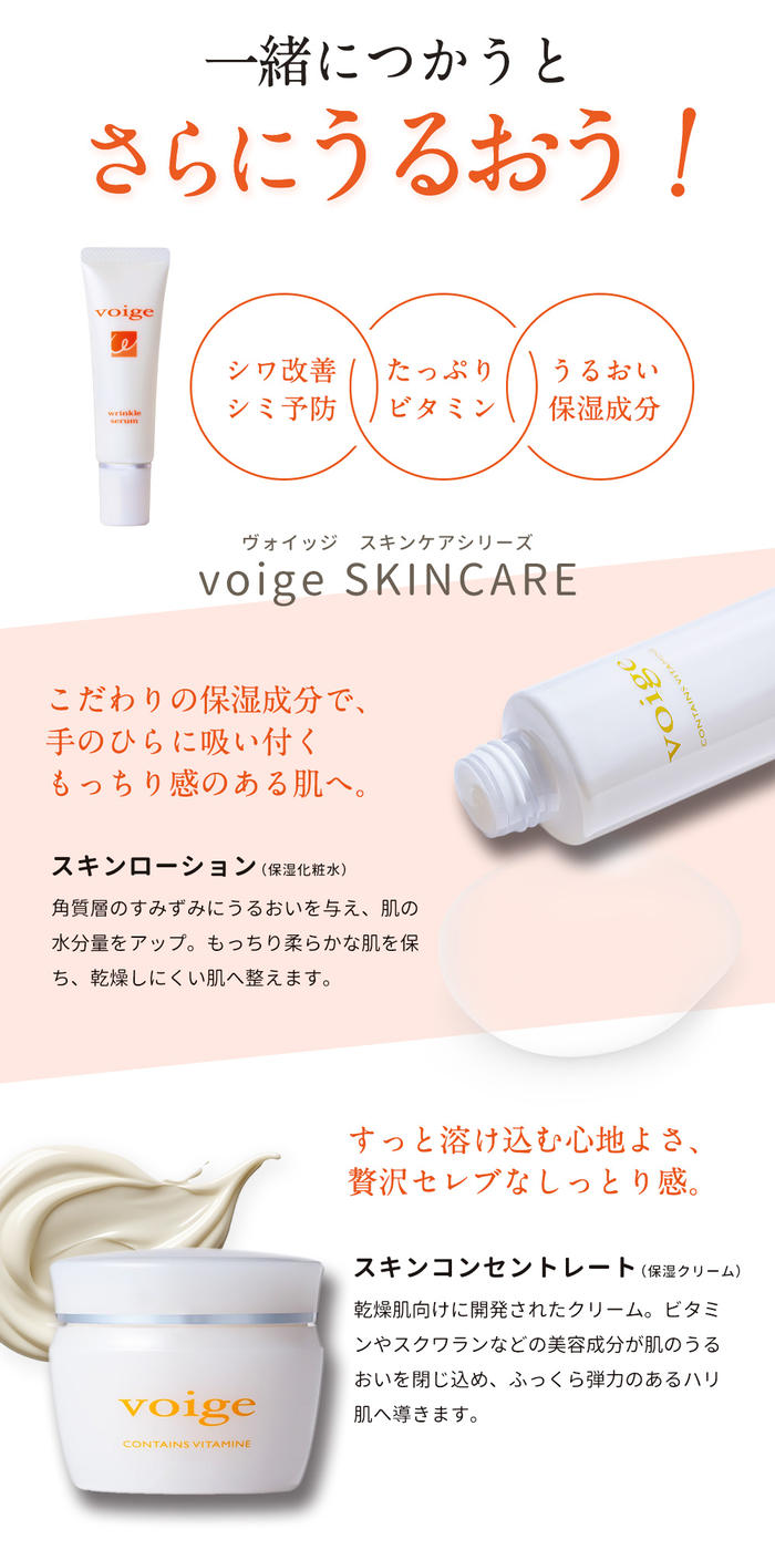 - voigeの保湿スキンケアシリーズと一緒にお使いいただくことで、エイジング※1のお悩みに対し保湿ケア・シワ改善・美白※2ケア、3方向からのアプローチを叶えます!